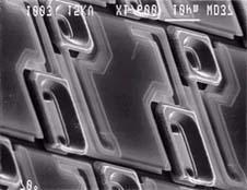 It consists of a two-layer structure. An interconnecting readout circuitry is applied to the silicon process wafer and then the microbolometer structure is built on top of the readout circuitry. First a pattern of islands _ wavelength thick are deposited on the readout circuitry. The islands are made of a material that can be selectively etched away later to form a bridge structure. Three layers -- silicon nitride, vanadium oxide, and silicon nitride -- are deposited over the sacrificial islands. The sacrificial islands are then etched away leaving the thermally isolated bridge structure of vanadium oxide. A photo of an early Honeywell microbolometer element is shown in the picture below followed by a photo of one corner of a 320 by 240 microbolometer array |