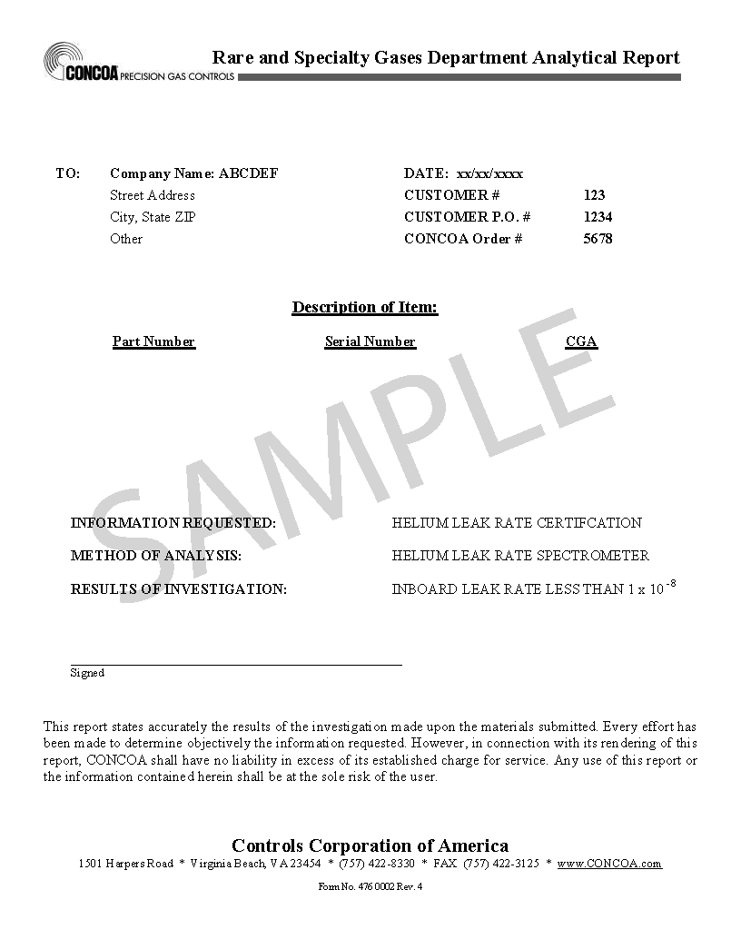 規格:美國CONCOA公司氦氣泄露證書(例子)